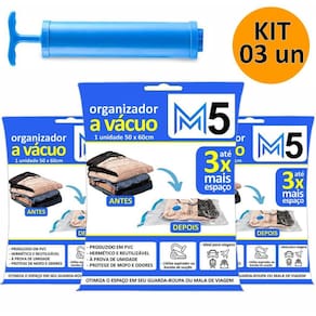 Kit 3 Saco a Vácuo 50x60cm Organizador Hermético para Mala de Viagem Guarda Roupa + Bomba Lançamento 2025 - Kit 3 Sacos a Vácuo Hermético 50x60cm Edredom Toalhas Roupas + Bomba Rosqueável - Material: PP, PE - Cor: Transparente - Tipo de Embalagem: Saco Plástico com Suporte - Marca: M5 Armarinhos - Espessura: 0,2mm - Contém: 3 unidades + 1 Bomba de Sucção Principais Características: - Reduz o volume, aumenta o espaço de armazenamento. - Reutilizável. - Hermético. - Impermeável. - Comprime. - Protege. - Organiza. - Super útil Para: Roupas, Toalhas, Almofadas, Cobertor e etc.. Instruções de uso: - Verifique o tamanho do saco a vácuo que necessita. - Coloque suas roupas volumosas, almofadas, etc... - Feche, deslizando o zíper. Verifique se estar bem fechado para garantir o resultado. - Encaixe o aspirador ou bomba de sucção do bocal do saco do vácuo. - Ligue o aspirador de pó, ele sugara o ar de dentro do saco, comprimindo o conteúdo. - Retire o aspirador de pó ou bomba e feche a tampa corretamente. - Reduz o espaço no seu guarda-roupa. Atenção: - As peças devem estar completamente limpa e secas. - Não guarde objetos pontiagudos, cortantes ou com arestas. - Não guarde couro. Cuidados: - Guarde em local seco, fresco, longe de umidade e ao abrigo do sol. - Mantenha longe de objetos pontiagudos, cortantes ou quentes. - Para evitar sufocamento, manter o saco plástico longe de crianças e bebês. Não usar este saco plástico em berços, camas, carrinhos e cercados. - Guarde estas instruções para futuras consultas. - Manter fora do alcance das crianças. : Marca: Não Informado Ean: 7894017025919
