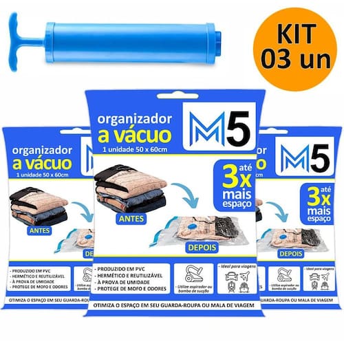 Kit 3 Saco a Vácuo 50x60cm Organizador Hermético para Mala de Viagem Guarda Roupa + Bomba Lançamento 2025 - Kit 3 Sacos a Vácuo Hermético 50x60cm Edredom Toalhas Roupas + Bomba Rosqueável - Material: PP, PE - Cor: Transparente - Tipo de Embalagem: Saco Plástico com Suporte - Marca: M5 Armarinhos - Espessura: 0,2mm - Contém: 3 unidades + 1 Bomba de Sucção Principais Características: - Reduz o volume, aumenta o espaço de armazenamento. - Reutilizável. - Hermético. - Impermeável. - Comprime. - Protege. - Organiza. - Super útil Para: Roupas, Toalhas, Almofadas, Cobertor e etc.. Instruções de uso: - Verifique o tamanho do saco a vácuo que necessita. - Coloque suas roupas volumosas, almofadas, etc... - Feche, deslizando o zíper. Verifique se estar bem fechado para garantir o resultado. - Encaixe o aspirador ou bomba de sucção do bocal do saco do vácuo. - Ligue o aspirador de pó, ele sugara o ar de dentro do saco, comprimindo o conteúdo. - Retire o aspirador de pó ou bomba e feche a tampa corretamente. - Reduz o espaço no seu guarda-roupa. Atenção: - As peças devem estar completamente limpa e secas. - Não guarde objetos pontiagudos, cortantes ou com arestas. - Não guarde couro. Cuidados: - Guarde em local seco, fresco, longe de umidade e ao abrigo do sol. - Mantenha longe de objetos pontiagudos, cortantes ou quentes. - Para evitar sufocamento, manter o saco plástico longe de crianças e bebês. Não usar este saco plástico em berços, camas, carrinhos e cercados. - Guarde estas instruções para futuras consultas. - Manter fora do alcance das crianças. : Marca: Não Informado Ean: 7894017025919