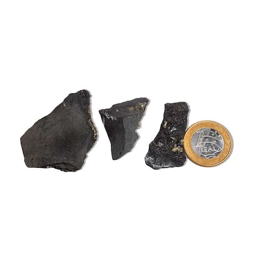 Apresentamos uma pedra rara e autêntica: Shungite com Pirita Incrustada. Esta peça, que chega diretamente da Rússia, é uma verdadeira raridade no Brasil, especialmente por sua combinação única de Shungite e Pirita, criando um visual deslumbrante. A pedra não é sintética nem de laboratório – ela é natural, extraída diretamente da terra. Esta é a peça perfeita para colecionadores de pedras raras ou para aqueles que buscam a energia poderosa da Shungite no esoterismo. Características:\nNome das Pedras: Shungite com Pirita Cor das Pedras: Preto Fosco com pigmentos dourados brilhantes (Pirita) sobre a superfície Corte das Pedras: Natural, sem lapidação Claridade das Pedras: Denso, sem transparência Medidas Aproximadas: 10 a 50 mm Peso Aproximado: 25 a 50 Gramas Origem: Rússia\nPropriedades e Benefícios: A Shungite é uma pedra com uma poderosa capacidade de absorção e transmutação de energias negativas, além de atuar como um escudo contra radiações eletromagnéticas. Suas propriedades terapêuticas são conhecidas por promoverem um equilíbrio saudável no corpo físico, mental e emocional. É ideal para quem busca harmonizar a energia ao seu redor e purificar o ambiente. A presença da Pirita, com seus lindos brilhos dourados, complementa ainda mais o poder da Shungite, trazendo uma energia extra de prosperidade e força. Esta combinação torna a pedra ainda mais rara e valiosa. Uso Tradicional e Histórico: Shungite é um mineraloide de origem orgânica, com um histórico de uso na região da Península de Karélia, na Rússia, desde os tempos antigos. Seu poder de purificação era bem conhecido, e a região foi o local do primeiro SPA da Rússia, fundado por Pedro o Grande em 1714, aproveitando as propriedades purificadoras da Shungite. No passado, a Shungite era utilizada para purificar a água e tratar doenças de pele. Hoje em dia, é amplamente valorizada por suas qualidades esotéricas, sendo um excelente aliado para o equilíbrio emocional e espiritual. Por que escolher esta peça?\nRaridade: Pedra natural rara, difícil de encontrar no Brasil. Beleza única: A combinação de Shungite com Pirita cria um visual incrível e energicamente poderoso. Marca: CristaisdeCurvelo