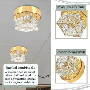 - Materiais: metal e cristal k9. - Dimensões do cristal CxLxA : 7 cm x 7 cm x 4,5 cm - Dimensões da base: Diâmetro: 12 cm Altura: 2,5 cm Compatível com caixinha de força 4x4 Altura total do plafon: 7,5 cm