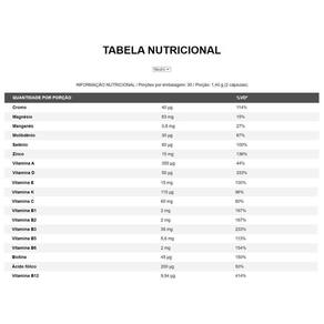 Bisglicinato de magnésio, ácido ascórbico, niacinamida, menaquinona-7, colecalciferol, L-selenometionina, betacaroteno, bisglicinato de manganês, D-biotina, palmitato de retinol, tiamina mononitrato, riboflavina, fitomenadiona, L-metilfolato de cálcio, molibdato de sódio, bisglicinato de zinco, metilcobalamina, DL-alfa-tocoferol, D-pantotenato de cálcio, fosfato de piridoxal, picolinato de cromo, estabilizante celulose microcristalina e lubrificante estearato de magnésio. Cápsula estabilizante hidroxipropilmetilcelulose, glaceantes carragena e acetato de potássio e corante clorofilina cúprica. NÃO CONTÉM GLÚTEN.
