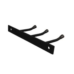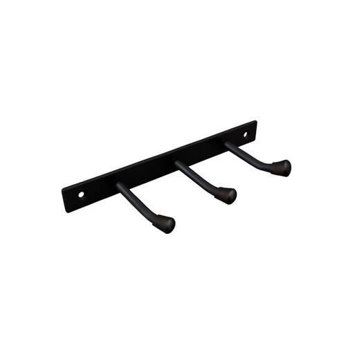 O Kit NV811PR é composto por 3 suportes de parede na cor preta, cada um com 3 ganchos reforçados alinhados lado a lado. No total, são 9 ganchos. Cada gancho comporta até 2 cabos de vassouras, rodos, pás ou outros utensílios, permitindo organizar até 18 itens de forma prática e segura.