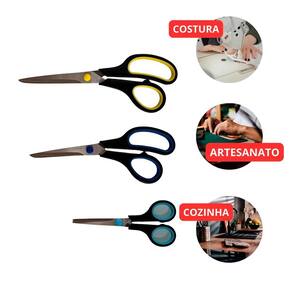 Kit 3 Tesouras Inox Multiuso Costura Artesanato Escritório Kit 3 Tesouras Inox Multiuso - Costura Artesanato Escritório Para cada tarefa, a tesoura perfeita. Este kit de 3 tesouras multiuso foi desenvolvido para unir precisão, durabilidade e conforto, oferecendo a solução ideal para todas as suas necessidades de corte em costura, artesanato, escritório e uso doméstico. Com lâminas afiadas em aço inox, garante cortes limpos e sem rebarbas em diferentes materiais, proporcionando resultados profissionais com facilidade e segurança. Versáteis e indispensáveis, essas tesouras são perfeitas para cortar tecidos, papéis mais grossos, EVA e diversos materiais utilizados em projetos maiores. No dia a dia, acompanham você em tarefas de escritório, trabalhos escolares, embalagens e pequenos reparos. Além disso, são essenciais para detalhes finos, cortes delicados em bordados, remoção de fios soltos na costura e trabalhos de artesanato que exigem atenção minuciosa. O design ergonômico com cabos em ABS e borracha proporciona pegada firme e confortável, permitindo maior controle e reduzindo a fadiga das mãos mesmo após longos períodos de uso. Cada tamanho de tesoura é pensado para uma função específica, garantindo que você tenha sempre a ferramenta ideal em mãos: - Tesoura 8,5 polegadas 21cm : ideal para cortes maiores e materiais mais espessos. - Tesoura 7,5 polegadas 20cm : equilíbrio perfeito para usos variados no cotidiano. - Tesoura 5,5 polegadas 14cm : indicada para cortes de precisão e acabamentos. Especificações Técnicas - Modelo: Conjunto 3 Tesouras BOM-3301 - Material: Aço Inox / ABS / Borracha - Tesoura 8,5 - Comprimento: 21cm Espessura: 1,0cm Largura: 7,3cm - Tesoura 7,5 - Comprimento: 20cm Espessura: 0,9cm Largura: 6,2cm - Tesoura 5,5 - Comprimento: 14cm Espessura: 0,9cm Largura: 6,0cm Itens Inclusos - 01 Tesoura 8,5 polegadas - 01 Tesoura 7,5 polegadas - 01 Tesoura 5,5 polegadas Este kit é a escolha certa para quem busca desempenho superior, resistência e praticidade. As lâminas de aço inox garantem maior durabilidade e precisão por muito mais tempo, enquanto os cabos anatômicos asseguram conforto e firmeza em cada corte. Produto com de 3 meses contra defeitos de fabricação, reforçando nosso compromisso com a qualidade e sua total satisfação. Com o Kit 3 Tesouras Inox Multiuso, você terá sempre a ferramenta certa para cada situação, seja na costura, no artesanato, no escritório ou em casa, com qualidade, confiança e versatilidade.