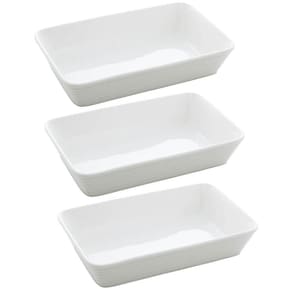 Garantia: 90 dias / Peso total: 1,974kg / Cor predominante: branco / Referência: 7794463623991; Dimensões de cada travessa: 20cm (C) x 15cm (L) x 5cm (A); Dimensões da área de uso de cada travessa: 19cm (C) x 14cm (L) x 4,5cm (A); Capacidade de cada travessa: 750ml; Conteúdo: 3 travessas de porcelana; Material: porcelana.