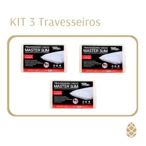 Kit 3 Travesseiros Viscoelástico Master Slim:O Travesseiro Viscoelástico Master Slim é perfeito para suas noites de sono, ajuda na circulação sanguínea e absorve a pressão do corpo. Para o máximo aproveitamento do sono. trazendo um conforto inigualável e toque macio.Tecnologia: A Master Comfort trabalha com a tecnologia de ponta em espuma Viscoelástica formulada com ativadores estabilizantes, aditivos e agentes de expansão, para obter a espuma de memória de alta qualidade.Sobre o Travesseiro Viscoelástico Master Slim:- Núcleo de Alto Suporte- Absorve a pressão do corpo.- Camada Externa de Alto Conforto- Antialérgico.- Projetado com alta tecnologia.- Termossensível- Não aquece com o calor corporal-Medidas do Travesseiro: 35x55x9 cm-Contém 03 Travesseiros