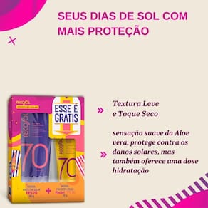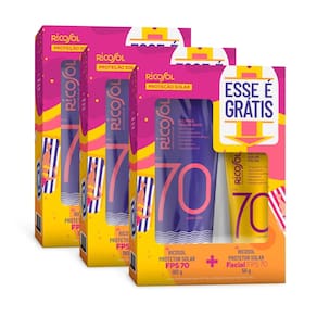 Kit Ricosol FPS 70 Corpo 180g + FPS 70 Facial 50g O Kit Ricosol FPS 70 Corpo e FPS 70 Facial é a solução perfeita para quem busca alta proteção solar para o corpo e para o rosto. Com produtos formulados para oferecer proteção intensa contra os raios UVA e UVB, este kit é ideal para quem deseja uma proteção eficaz durante a exposição ao sol. Oferece uma barreira eficaz contra os raios UVA e UVB, ajudando a prevenir queimaduras solares e danos à pele. Contém ingredientes que mantêm a pele do corpo hidratada e macia durante a exposição ao sol. Absorve rapidamente sem deixar a pele pegajosa, proporcionando um acabamento seco e confortável.