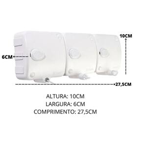 Kit 3 varal expansível retrátil automático com 6 metros modular O varal automático oferece uma solução conveniente e prática para secar suas roupas. Sua versão retrátil permite que você tenha uma extensão de corda de até 6 metros, oferecendo amplo espaço para pendurar suas roupas. Cada corda suporta até 6 kg de peso, garantindo que você possa secar várias peças de roupa de uma só vez.