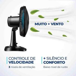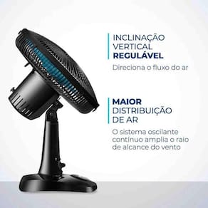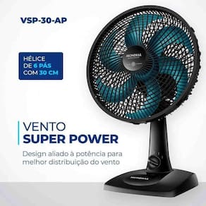 o Ventilador Super Power VSP-30-AP e mais vento. Ele tem BAIXO NIVEL DE RUIDO, SISTEMA OSCILANTE lateral, INCLINACAO VERTICAL REGULAVEL, alem ser compacto e ter baixo consumo. Sua HELICE TEM DESIGN AERODINAMICO, o que proporciona um vento forte. Como ele faz MENOS BARULHO, com qualquer uma das 3 VELOCIDADES, voce dorme com ventinho e silencio garantidos. Para AMBIENTES MAIS AMPLOS, voce pode usar seu SISTEMA OSCILANTE. Ja sua INCLINACAO VERTICAL REGULAVEL DIRECIONA O FLUXO DE AR para cima ou para baixo. Como a GRADE FRONTAL E REMOVIVEL, ele ainda e FACIL DE MONTAR e desmontar para limpeza. Ele tambem e FACIL DE CARREGAR porque tem uma alca para . Ja a BASE ANTIDERRAPANTE traz mais seguranca. O Ventilador 30cm Super Power VSP-30-AP foi desenvolvido para USO DOMESTICO, sendo melhor para uso residencial. Tudo isso com 1 ANO DE GARANTIA MONDIAL. A Mondial e a escolha de milhoes de consumidores. Cor Preto/Azul Voltagem (Tensao) Preto/Azul Petroleo Itens inclusos 01 Ventilador e 01 Manual de Instrucoes Potencia 60W Dimensoes do produto 51,00x35,00x28,00 Numero de velocidades 3 Quantidade de pas 6 Coluna ajustavel * Tipo de ventilador Ventilador de mesa Peso 1,60 Inclinacao regulavel Sim Oscilante Sim Garantia 1 Ano