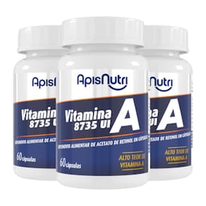 Kit 3 Vitamina A 8735UI Apisnutri 60 Cápsulas Sobre o produto Encontrada tanto em alimentos de origem animal como fígado, gema de ovo e leite, quanto em fontes vegetais, como manga, cenoura e mamão o retinol está sob a forma de seus precursores, ou seja, substâncias que dentro do organismo se transformam em vitamina A. Fundamental para a manutenção da vida, é importante para a saúde da visão e da pele, no funcionamento do sistema imune, contribui para o metabolismo do ferro e manutenção das mucosas além de ajudar no processo de diferenciação celular. Modo de usar Ingerir 1 cápsula ao dia. Recomendação de uso: 19 dezenove anos ou acima. Ingredientes Ingredientes: Acetato de retinol e lubrificante talco. Cápsula: gelatina e água deionizada. NÃO CONTÉM GLÚTEN. este produto não é um . não exceder a recomendação diária de consumo indicada na embalagem. mantenha fora do alcance de crianças. gestantes e lactantes, somente devem consumir este produto sob orientação de nutricionista ou médico. Manter a embalagem bem fechada e em local seco e fresco. Não expor a luz solar. Consumir em até 60 dias após aberto. Isento de registro no M.S. Conforme RDC 240/2018. Apresentação Classificação: Suplemento alimentar de Acetato de Retinol em cápsulas Quantidade de cápsulas: 60 cápsulas de 300mg Peso Líquido: 18g Marca: Não Informado