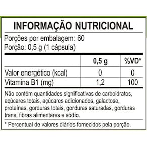 Cada porção de 0,5 g 1 cápsula contém 100% da necessidade diária recomendada de Vitamina B1.