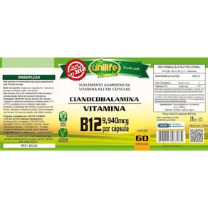 Kit 3 vitamina b12 cianocobalamina unilife 60 cápsulas Sobre o produto Vitamina de oritem sintética, produto vegano, sem origem animal A vitamina b12, é fundamental para todos os músculos do nosso organismo, sistema nervoso e saúde do sangue. Essa vitamina não é produzida no nosso corpo e por isso deve ser ingerida na alimentação ou através de suplementação. Como é produzida por alguns microrganismos presentes em produtos de origem animal e poucos alimentos vegetais possuem essa vitamina, é extremamente importante para os vegetarianos realizarem a suplementação, evitando anemias, derrames e até mesmo doenças cardiovasculares. Benefícios Benefícios do uso da vitamina b12 cobalamina em cápsulas Ajuda a formar as células vermelhas do sangue; é o mais poderoso antianêmico já existente para a anemia perniciosa; Melhora a capacidade da memória e concentração; É necessária para auxiliar na formação e longevidade das células; Importante para uma digestão apropriada, absorção dos alimentos; Previne danos aos nervos, mantém a fertilidade; sua deficiência causa atrasos no crescimento, distúrbios nervosos e reprodutivos. Como usar a vitamina b12 em cápsulas Sugere-se a ingestão de 1 cápsula ao dia, após a refeição. Ingerir com líquido. Modo de uso 100% da ingestão diária recomendada em apenas 1 cápsula Ingredientes Vitamina b12 cianocobalamina , excipiente .S.P. 450mg, gelatina vegetariana e água. Não contém glúten. Livre de lactose. Produto vegano. Cada cápsula contém 2,4 mcg de vitamina b12. Marca: Não Informado