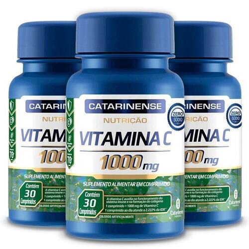 Kit 3 Vitamina C 1000mg Catarinense Pharma 30 Cápsulas A vitamina C auxilia na absorção de ferro dos alimentos, no metabolismo de proteínas e gorduras e no metabolismo energético. A vitamina C é um antioxidante que auxilia na proteção dos danos causados pelos radicais livres e na formação do colágeno. A vitamina C auxilia na regeneração da forma reduzida da vitamina E e no funcionamento do sistema imune. Ingredientes Ácido ascórbico. Agente carreador celulose microcristalina INS 460i , estabilizante croscarmelose sódica INS 468 , glaceantes: copolímero enxertado de álcool polivinílico e polietilenoglicol INS 1209 , talco INS 553iii , hidroxipropilcelulose INS 463 , polivinil álcool INS 1203 , antiaglutinantes: estearato de magnésio INS 470iii , dióxido de silício INS 551 , corantes: dióxido de titânio INS 171 e laca de alumínio com amarelo crepúsculo INS 110 e emulsificante mono e diglicerídeos de ácidos graxos INS 471 . NÃO CONTÉM GLÚTEN. Recomendações de Uso Consumir 1 comprimido ao dia, atende 100% da Ingestão Diária Recomendada IDR para adultos 19 anos ou mais . Deve ser ingerido com líquido.