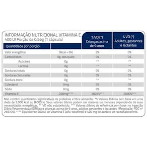 A Vitamina E de 400mg (acetato de racealfatocoferol) possui alto teor de vitamina E em cápsulas gelatinosas moles (fácil de engolir).