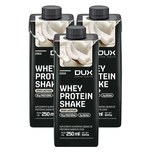 Whey Protein Shake DUX Performance, qualidade e sabor. Para todos que buscam um estilo de vida ativo e saudável, o Whey Protein Shake DUX é a versão pronta para consumo do whey protein que você já conhece. O Whey Protein Shake DUX é uma bebida proteica desenvolvida com as melhorestecnologias e ingredientes para entregar praticidade, qualidade e segurança para sua rotina. Basta abrir e se deliciar com o sabor surpreendente do shake. O que é? Protein Shake DUX® é uma fórmula inovadora desenvolvida para todos que buscam um estilo de vida ativo e saudável. Com 15g de proteína, 3g de BCAA e zero lactose, esta bebida proteica está disponível nos sabores Doce de Leite, Cookies, Chocolate Branco, Chocolate, Coco e Café com Leite, proporcionando a perfeita harmonia entre qualidade, praticidade e sabor. Além disso, suas embalagens 100% recicláveis reforçam nosso compromisso com a sustentabilidade. Ideal para: Protein Shake DUX é para você que procura: Uma solução prática e saborosa para aumentar sua ingestão de proteínas e manter um estilo de vida ativo e saudável. Uma bebida proteica pronta para consumo, com 15g de proteína, 3g de BCAA e zero lactose, disponível nos sabores Doce de Leite, Cookies, Chocolate Branco, Chocolate, Coco e Café com Leite. Um produto alinhado com a sustentabilidade, graças a embalagens 100% recicláveis. Os shakes proteicos são ótimas opções para lanches entre as refeições principais, já que possuem baixas quantidades de carboidratos e gorduras, e são fontes de proteínas de alto valor biológico, BCAAs e cálcio. Ideal tanto para praticantes de exercícios físicos, como para todos que buscam um estilo de vida saudável. Sugestão de uso: Protein Shake é um suplemento alimentar líquido que você pode consumir no horário de sua preferência.