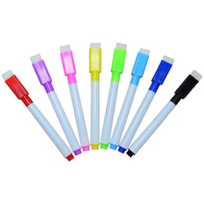 cor da tinta: preto todas as canetas possuem a tinta de cor preta, apenas as tampas são coloridas as cores das tampas são enviadas de acordo com a disponibilidade em estoque , na ponta da tampa encontra-se uma espuma para apagar e na lateral um ímã que permite que grudem em superfícies metálicas. Contém: 30 canetas para quadro branco 11x1cm com apagador e ímã na tampa