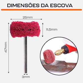 - Marca: Dremax - Referência: EPN-K25 - Material: Fibra do nylon - 5 Escovas Grão G120 Bege - 5 Escovas Grão G180 Verde - 5 Escovas Grão G320 Vermelho - 5 Escovas Grão G400 Preto - 5 Escovas Grão G800 Cinza - 5 Escovas Polimento Algodão - Diâmetro da escova: 25mm 1 Pol. - Espessura aproximada da escova: 11,5mm - Diâmetro da haste: 3mm 1/8 Pol. - Comprimento Aproximado: 47mm - Escova tipo Scotch Brite - Velocidade de trabalho recomendada: 2.000 a 12.000rpm - As escovas almofadas de polimento são usadas em polimento madeira, metal, polimento de pedra etc. , gravura, moagem, lixamento e limpeza - Ideal para limpeza, desbaste e polimento de todos os tipos de joias e metais preciosos. - Acessório indicado para joalheiros, serralheiros, armeiros, técnicos, colecionadores de moedas, arqueólogos, estudantes, etc. - Indicado para todas as marcas de micro retíficas, como Dremel, Charbs, Einhell, Black+Decker, Dremax, Mondial, Vonder, Titanium, Western, Ingco, Gamma, Wesco, etc. - Peso bruto: 104 gramas - Dimensões da Embalagem: 150 x 12 x6mm - : 90 dias contra defeitos de fabricação A DREMAX é a primeira e única marca brasileira dedicada exclusivamente às micro retíficas, acessórios e acoplamentos para esta indispensável ferramenta. Seja para trabalhos de precisão, artesanato, modelagem ou reparos, a DREMAX tem o produto certo para você.