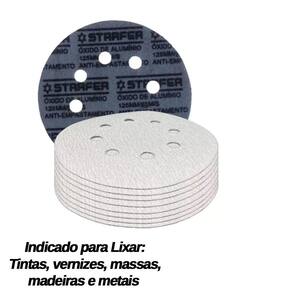 CARACTERÍSTICAS TÉCNICAS: Material: Resina, óxido de alumínio, papel e pluma Medidas: 125mm (5”) Quantidade de furos: 8 Limite máxima: 12220rpm, 80m/s Marca: Starfer