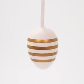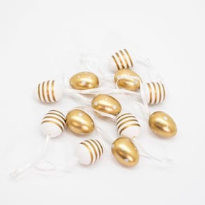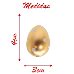 Especificações: Cor: Branco com Dourado Material: Isopor e Plástico Medidas: 4cm x 3cm Modelo: Pendente Acompanha: 36 Ovos Pendentes de Páscoa.