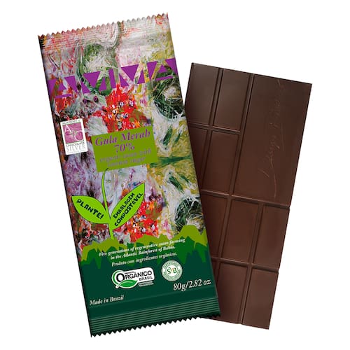 Chocolate orgânico 70% cacau com açúcar de coco. Possui sabor frutado, lembrança de dias dourados. Toda a potência do cacau com o açúcar de coco, o mais antigo, saudável e sustentável da humanidade.