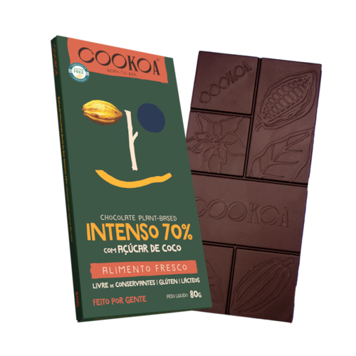 Para criar uma experiência única, o Chocolate Intenso 70% Cacau Vegano Cookoa é composto por um blend exclusivo de amêndoas do cacau forasteiro da Bahia, ao sabor frutado e marcante do cacau selvagem amazônico e a suavidade exótica do cacau criollo peruano.