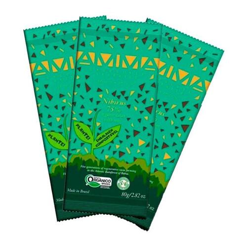 O Chocolate Nibirus 75% Nibs de Cacau Orgânico Amma Chocolate leva o cacau orgânico plantado em cooperativas e assentamentos certificados, fortalecendo a cultura agroflorestal em todo o Brasil.