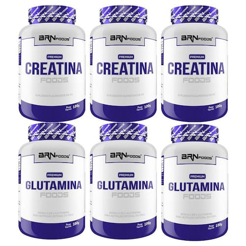 3x PREMIUM Creatina 100g + 3x PREMIUM Glutamina 100gO KIT 3x PREMIUM Creatina 100g + 3x PREMIUM Glutamina 100g é composto por produtos que são referência no mercado, além de oferecer um ótimo custo benefício. Premium Creatina Foods: A Creatina é responsável pela produção de energia em células musculares, fornecendo muito mais disposição durante os treinos. A Creatina também ajuda a suprir as necessidades nutricionais do corpo humano, contribuindo com o ganho de massa muscular e auxiliando na recuperação dos músculos. Premium Glutamina Foods: A Glutamina é indispensável na dieta de quem pratica treinos longos, intensos e regulares e sua suplementação é responsável pela construção de proteínas no corpo humano. Desta forma, a Glutamina ajuda a melhorar o seu desempenho e performance durante os exercícios do dia a dia, além de auxiliar na recuperação e manutenção dos músculos. Imagem meramente ilustrativaO rótulo e a embalagem podem variar de acordo com o lote.