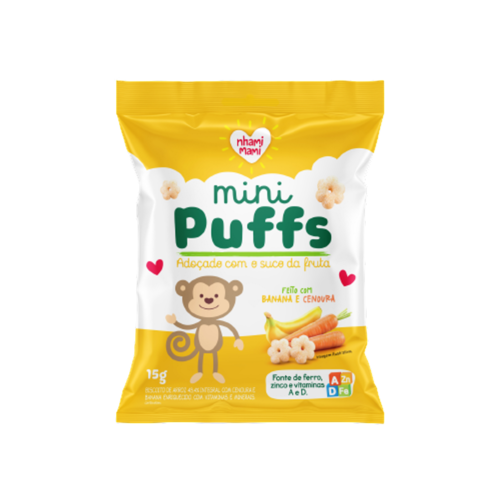O Snack Infantil Mini Puffs Banana e Cenoura Nhami Mami é saudável e feito com muito amor e carinho. Tem um sabor delicioso e vem em um formato diferente, para a criança comer bem enquanto se diverte!