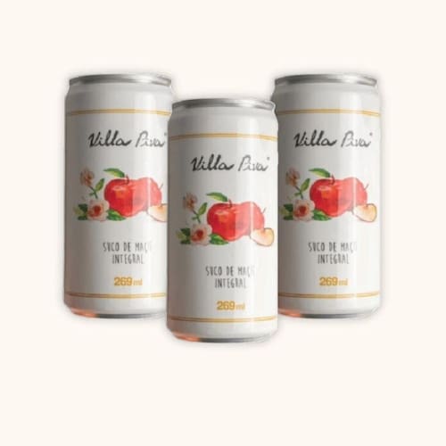 Kit 3X: Suco de Maçã Integral Sem Açúcar Lata Villa Piva 269ml O Suco de Maçã Integral Sem Açúcar Lata Villa Piva é produzido somente com 2kg de maçãs frescas por litro, sem elementos artificiais, corantes, açúcares ou conservantes.