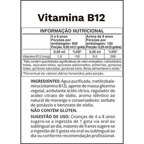 Vitamina B12 Metilcobalamina A vitamina B12 é importante para o bom funcionamento de diversos processos em nosso corpo, entre eles: mental, aparência, qualidade de vida, cuidados ao bem-estar geral entre variados benefícios presentes na vitamina B12, um nutriente que em sua forma natural oferece alto teor de metilcobalamina. Essa vitamina essencial é a chave para um corpo ativo e mente alerta. Benefícios: Apoio Energético; Benefício Mental; Otimiza o sistema de defesas naturais do corpo; Com benefícios a pele, cabelo e unhas atuando na aparência e a qualidade de vida; Pode atuar na estabilidade do humor; Pode promover uma sensação geral de bem-estar; Suplementação eficiente: a B12 vem na forma ativa, metilcobalamina, que é utilizada diretamente pelas vias sem necessidade de conversão. 100% Vegano: apropriado para quem segue dietas vegetarianas ou veganas. Sem adição de açúcar ou adoçantes: Não há adição de açúcar ou qualquer tipo de adoçante; Econômico e prático: as gotas podem ser consumidas em qualquer lugar, oferecendo um ótimo custo-benefício; Melhor absorção: a forma líquida favorece a absorção sublingual mais rápida. Fácil consumo: especialmente para idosos e crianças, ou para quem tem dificuldades de deglutição. Recomendação de uso: Crianças de 4 a 8 anos sugere-se a ingestão de 1 gota via oral ou sublingual ao dia, maiores de 9 anos sugere-se a ingestão de 5 gotas via oral ou sublingual ao dia o conforme recomendação .