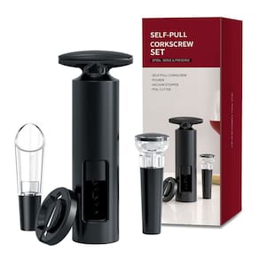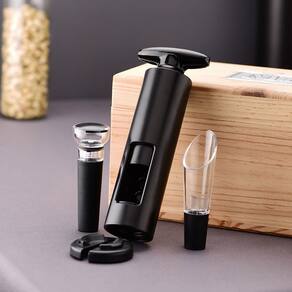 Kit com 4 acessórios para vinho: abridor de garrafas, cortador de cápsulas, aerador de vinho, anel anti-gotas. Inclui saca-rolhas, bico dosador e tampa para vinho. Material: Plástico. Cor: Preto.Vendido por Clic Casa e entregue por Casas Bahia