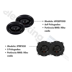 • Potência RMS: 220W RMS • Impedância Nominal: 4 Ohms • Resposta de Frequência do Sistema: 42 a 20000 Hz • Sensibilidade (1W@1m): 85 dB SPL • Freq. Corte Mínima Recomendada: 80,00 Hz • Diâmetro Nominal: 6x9 Polegadas
