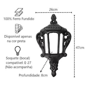 A Arandela Externa Interna de Parede em Ferro Fundido é a escolha perfeita para quem busca durabilidade e estilo. Fabricada em ferro fundido, ela oferece uma combinação única de resistência e elegância para iluminar e decorar diversos ambientes, tanto internos quanto externos. Com design clássico e robusto, esta arandela é ideal para ser instalada em condomínios, jardins, praças, parques, proporcionando um toque sofisticado em qualquer espaço.