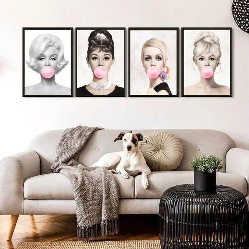 Kit 4 artistas bubble gum rosa 45x34cm - com vidro Moldura: madeira branca Informações do produto tire todas as suas dúvidas no descritivo abaixo: decoração para quarto, sala, cozinha, escritório, área gourmet e muito mais. Chega de paredes vazias medidas - cada peça tem 45x34cm a3 . Material do papel - papel fotográfico brilhante de altíssima resolução acabamento - todos os quadros são acompanhados de vidro para proteção da imagem. - moldura em madeira maciça na cor preta ou branca conforme produto escolhido e pendurador . - os quadros são embalados de forma segura com plástico bolha com camada dupla de acordo com o tamanho dos quadros. Garantia - garantia de 3 meses. Meu quadro chegou. Como posso fixá-lo Você precisa apenas de um martelo e um prego, pois os quadros já vão acompanhados de penduradores. Esta é a forma mais indicada. Como posso limpar meu quadro A limpeza é feita como um móvel comum da sua casa. Apenas um pano seco ou espanador são suficientes para tal