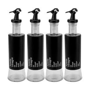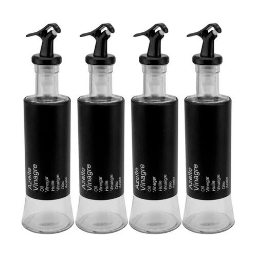 Kit 4 Azeiteiro Vinagreiro Recipiente em Vidro e Inox Preto com Bico Dosador O nosso Porta Azeite ou Vinagre em Vidro revestido em Aço Inox é um produto que alinha bom gosto, requinte, praticidade e durabilidade. Com um sistema de fácil abertura e fechamento com apenas uma das mãos. Não absorve o sem cheiro e nem gosto por ser produzido em vidro. Super prático de utilizar e higienizar.