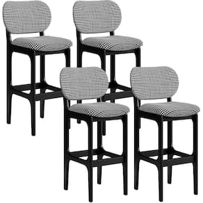 Amplamente sofisticado, o Kit 4 Banquetas Alta Bar Cozinha Sala Jantar Fixa Betta L02 Preto Suede Pied Poule - Lyam Decor irá agregar ainda mais valor em sua decoração!! Sendo capaz de compor muito bem o ambiente, é produzido com materiais de excelente qualidade, a resistente estrutura em madeira de Taeda, na cor preto, conta com apoio para os pés (que garante maior ), além do assento e encosto estofados super confortáveis e convidativos, que são revestidos em tecido Pied Poule, extremamente elegante.