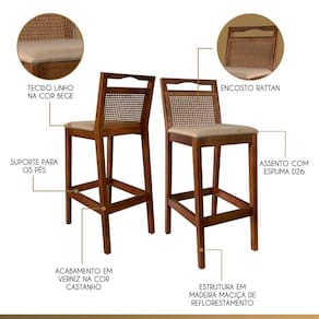 A Banqueta Valência em madeira maciça com acabamento em verniz combina estilo e conforto para sua cozinha. Assento em espuma D26, encosto em rattan e revestimento em linho bege completam o design atemporal. Perfeita para bancadas/mesas de 100/105cm, a Valência eleva o nível de requinte do seu ambiente. Invista em qualidade e leve elegância para sua casa!CARACTERÍTICAS TÉCNICAS:- Produzido em Madeira Maciça;- Acabamento em Verniz na cor Castanho;- Assento Preenchido com Espuma D26; - Encosto com Revestimento em Rattan com Fibra Sintética;- Revestimento em Linho na cor Bege.*Indicada para Bancadas/Mesas com Alt. 100/105cm.
