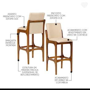 A Banqueta Alta Lisboa é o modelo ideal para complementar o seu ambiente. Dispõe de um design atual com assento e encosto estofado dando um conforto único ao móvel. As banquetas são móveis versáteis que podem ser utilizados em diversos ambientes e funcionalidades, permitindo composições na decoração e agregando conforto e sofisticação ao ambiente. Podem ser utilizadas em bancadas de salas conjugadas, mesas bistrô em sacadas gourmet ou aonde você precisar. Produzida com madeira maciça, garantindo a sua durabilidade e vida útil. CARACTERÍSTICA TÉCNICAS: - Produzido em Madeira Maciça - Acabamento em Verniz na cor Imbuia - Assento Estofado Preenchido com Espuma D23 - Encosto Estofado Preenchido com Espuma D18 - Tecido de Alta Qualidade em Linho na cor Bege M58 - Banqueta Entregue Montado *Kit Composto por QUATRO Banquetas INFORMAÇÕES TÉCNICAS: - Altura Total: 108 cm - Altura até o Assento: 75 cm - Largura Total: 43 cm - Profundidade Total: 46 cm INFORMAÇÕES ADICIONAIS: Garantia para defeitos de fabricação conforme Código de Defesa do Consumidor. - ATENÇÃO: Não nos responsabilizamos pela montagem, subir ou içar o móvel. - As imagens ambientadas são meramente ilustrativas e podem apresentar itens que não compõe o produto, as cores do produto podem variar de acordo com o monitor, a iluminação do ambiente ou sua percepção visual. - Limpeza: Deve ser feita com pano macio e seco ou levemente umedecido com água e sabão neutro. Não devem ser utilizados abrasivos.
