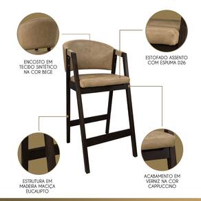 CARACTERÍSTICAS TÉCNICAS: - Produzido em Madeira Maciça; - Acabamento Verniz na Cor Capuccino; - Assento com Espuma D26; - Encosto com Espuma D23; - Revestido em Tecido Material Sintético na Cor Bege.