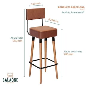 A banqueta Barcelona, possui 04 pés de madeira eucalipto com 60 cm de altura, e encosto estruturado, com seu design moderno, pode ser usada em sua área gourmet, área externa.