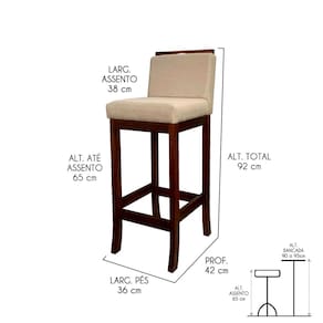 INFORMAÇÕES TÉCNICAS: Altura Total: 92 cm Altura até Assento: 65 cm Altura até Travessa: 13 cm Altura Encosto: 35 cm Largura Assento: 38 cm Largura Estrutura: 36 cm Profundidade Total: 42 cm Profundidade Assento: 41 cm Peso: 7 kg INFORMAÇÕES ADICIONAIS:ATENÇÃO: Móvel produzido em madeira maciça natural podendo ocorrer mudança no tom da madeira conforme o produto;*Conferir se o produto está de acordo com o que comprou, produto danificado não será aceito troca;**As imagens ambientadas são meramente ilustrativas e podem apresentar itens que não compõe o produto. As cores do produto podem variar de acordo com o monitor, a iluminação do ambiente ou sua percepção visual;***Limpeza deve ser feita com pano macio e seco ou levemente umedecido com água e sabão neutro. Não devem ser utilizados abrasivos como palha de aço e objetos cortantes;Garantia para defeitos de fabricação conforme Código de Defesa do Consumidor. Marca: CCS Interiores