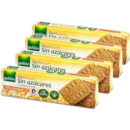 Kit 4 Biscoito Gullon Zero Açucar Fibra Integral 170G A missão da Gullón é oferecer à sociedade produtos saudáveis para satisfazer as necessidades diárias dos nossos consumidores e clientes, produtos baseados na inovação, que além de alimentar contribuem para levar uma vida mais satisfatória e de qualidade. O Biscoito Sem Açúcar Fibra Gullón 170g são bolachas sem açúcares, com alto teor de fibras e óleo de girassol alto oleico. Ingredientes: Farinha integral de trigo, edulcorante maltitol , óleo vegetal girassol alto oleico , fibra alimentar vegetal, fibra dervilha, gaseificantes carbonato ácido de sodio e carbonato ácido de amonio , emulgente lecitina de soja , sal, aromas. Pode contener traços de leite.