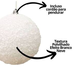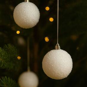 As bolas apresentam diâmetro de 8cm e vêm com cordão para pendurar, prontas para uso imediato na árvore, guirlandas ou arranjos decorativos. Seu acabamento branco fosco com efeito flocado reflete a luz suavemente, criando uma atmosfera natalina elegante e acolhedora.