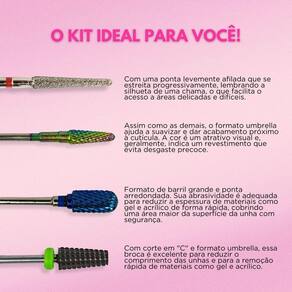 Contém: 01 - Broca M-Blue Large Barrel Ball ST 01 - Broca C Umbrella TRL Bit 01 - Broca Flame S F 720 01 - Broca M-Colorful Medium Umbrella ST O kit ideal para manicures Perfeito para todos os atendimentos, composto por cortes fino, médio e grosso. Indicado para profissionais que buscam precisão e eficácia em todas as etapas do alongamento, desde a remoção até o acabamento final. Cada broca foi projetada para uma função específica, garantindo versatilidade e resultado impecável: M-blue Large Barrel Ball ST: Design em acabamento azul possui abrasividade média. Entrega eficácia para reduzir rapidamente o comprimento e a espessura de materiais como gel e acrílico. O formato de barril permite cobrir uma área maior, enquanto a ponta arredondada ajuda a evitar danos à pele ao redor da unha. Broca C Umbrella TRL Bit: Com corte em C e formato Umbrella, essa broca é excelente para reduzir o comprimento das unhas e para a remoção rápida de materiais como gel e acrílico. É especialmente Utilizado por profissionais que precisam de eficiência sem comprometer a precisão. F Flame S F 720: Formato de chama e corte fino é ideal para remover gel próximo à cutícula sem agredir a unha natural. Oferece precisão e controle, sendo ótima para trabalhos de refinamento e para limpar áreas de difícil acesso. M Colourful Medium Umbrella ST:O formato Umbrella ajuda a suavizar e dar acabamento próximo à cutícula. A cor é um atrativo visual e indica um revestimento que evita desgaste precoce. Características Principais: - Cortes Fino, Médio e Grosso; - Kit com 4 Unidades; - Modelo Flame S F 720; - Modelo M-Blue Large Barrel Ball ST; - Modelo Broca C Umbrella TRL Bit; - Modelo M Colourful Medium Umbrella ST; - Ideal para todas as áreas e processos; - Não danifica as unhas naturais; - Perfeita para alongamentos de unhas, e acabamentos; - Garante precisão; - Acabamentos detalhados. Medidas: Flame S F 720: 4,5 Centímetros de Altura. M-blue Large Barrel Ball ST: 5 Centímetros de Altura. C Umbrella TRL Bit: 4 Centímetros de Altura. M Colourful Medium Umbrella ST: 5 Centímetros de Altura. Boas Compras ; Marca: Não Informado Ean: 7908639609225