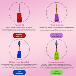 C colourful bullet st: ideal para detalhes delicados. O formato bullet é ótimo para alcançar áreas pequenas e precisas, tornando-a perfeita para remover material entre as dobras laterais das unhas ou trabalhar em áreas próximas às cutículas. O acabamento colorido facilita a identificação e também agrega estilo à ferramenta.