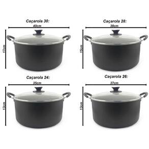 IMAGENS ILUSTRATIVAS Características: A Caçarola Grande Família é feita de alumínio reforçado, conferindo maior resistência ao produto. Conta com revestimento interno e externo de 5 camadas de antiaderente. A tampa de vidro possui furo para a liberação de vapor. As alças e o pomel são fabricados em baquelite antitérmico. Estas Caçarolas são fáceis de usar e limpar proporcionando maior praticidade e tempo na hora de preparar suas refeições. Especificações: - Tampa de Vidro - Anti Aderente - Alças Baquelite - Caçarola 30,28,26,24 - Alumínio Peso e Medida: 30: - Peso: 1,378 - Altura: 17 cm - Diâmetro: 30 cm - Largura: 40 cm 28: - Peso: 1,234 - Altura: 15 cm - Diâmetro: 28 cm - Largura: 38 cm 26: - Peso: 1,234 - Altura: 15 cm - Diâmetro: 26 cm - Largura: 35 cm 24: - Peso: 1,068 - Altura: 11 cm - Diâmetro: 24 cm - Largura: 33 cm Itens Inclusos: - 01 Panela Caçarola 24 cm - 01 Panela Caçarola 26 cm - 01 Panela Caçarola 28 cm - 01 Panela Caçarola 30 cm - 04 Tampa de Vidro