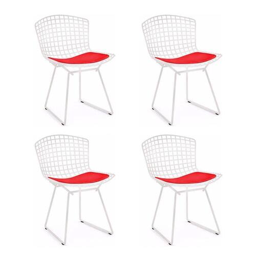 AS IMAGENS SÃO MERAMENTE ILUSTRATIVAS E PODEM SOFRER VARIAÇÕES DE COR E PEQUENOS DETALHES DE ACORDO COM O SEU MONITOR, ILUMINAÇÃO DO AMBIENTE E ATÉ MESMO A SUA PERCEPÇÃO VISUAL.Kit 4 Cadeiras Bertoia Branca com Assento Vermelho