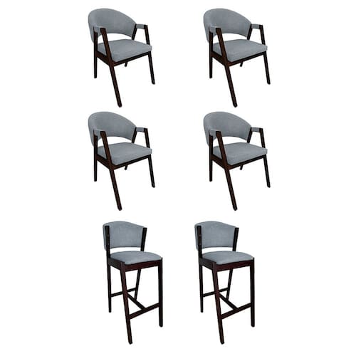 Kit 4 Cadeiras de Jantar Helen com 2 Banquetas Ana Madeira Maciça Castanho Premium Linho Cinza