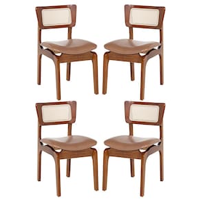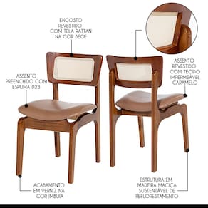 Se você está procurando uma cadeira que se destaque em todos os ambientes, precisa conhecer a nossa cadeira da linha Portugal. Com um design moderno, ela vai se adequar perfeitamente às suas necessidades do dia a dia. A Cadeira Portugal é perfeita para ser utilizada em diversos espaços, como a mesa de jantar, no home office, no quarto como apoio, salas de estar como assento extra, e muito mais. Ela traz estilo e funcionalidade para qualquer ambiente em que for colocada. Produzida com materiais de excelente qualidade, a Cadeira Portugal garante maior durabilidade e resistência. Não perca mais tempo procurando a cadeira perfeita e venha conhecer nosso catálogo para deixar sua casa mais completa e cheia de estilo com todos os produtos da Rio Madeira Interiores. CARACTERÍSTICAS TÉCNICAS: - Produzido em Madeira Maciça Sustentável - Acabamento em Verniz na cor Imbuia - Encosto com Revestimento em Rattan com Fibra Sintética Quadriculada na cor Bege - Assento Estofado Preenchido com Espuma D23 - Assento com Revestimento em Tecido Impermeável Caramelo L85 - Cadeira Entregue Montada *Kit Composto por Quatro Cadeiras Portugal INFORMAÇÕES TÉCNICAS: Altura Total: 80 cm Altura Chão até Assento: 45 cm Largura Total: 50 cm Profundidade Total: 50 cm Peso: 5 kg INFORMAÇÕES ADICIONAIS: Garantia para defeitos de fabricação conforme Código de Defesa do Consumidor. - Produto em madeira maciça natural, podendo ocorrer variação no tom ou cor da madeira. - As imagens ambientadas são meramente ilustrativas e podem apresentar itens que não compõe o produto, as cores do produto podem variar de acordo com o monitor, a iluminação do ambiente ou sua percepção visual. - Limpeza: Deve ser feita com pano macio e seco ou levemente umedecido com água e sabão neutro. Não devem ser utilizados abrasivos.