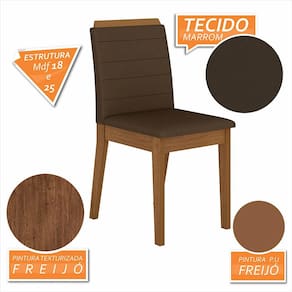 Detalhes Técnicos das Cadeiras: -Acabamento da Cadeira: Assento e Encosto Tapeçados -Almofada do Assento: Fixa -Cadeira Estofada: Sim -Peso Suportado da Cadeira: 90KG -Facilidade da Montagem: Média -Tonalidade da estrutura da Cadeira: Freijó -Tonalidade do Tecido: Suede Marrom - Assento: D16 -Encosto: D14 -Tipo de Pintura: UV Texturizada -Material da Estrutura: MDF 25mm e 18mm -Medida da Cadeira: 95CM x 44CM x 50CM
