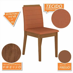 Detalhes Técnicos das Cadeiras: -Acabamento da Cadeira: Assento e Encosto Tapeçados -Almofada do Assento: Fixa -Cadeira Estofada: Sim -Peso Suportado da Cadeira: 90KG -Facilidade da Montagem: Média -Tonalidade da estrutura da Cadeira: Freijó -Tonalidade do Tecido: Suede Terracota - Assento: D16 -Encosto: D14 -Tipo de Pintura: UV Texturizada -Material da Estrutura: MDF 25mm e 18mm -Medida da Cadeira: 95CM x 44CM x 50CM